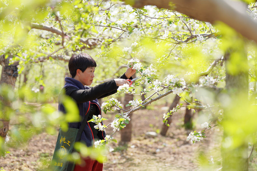 ↑4月13日,内丘县岗底村果农在果园内疏花。近日,河北省内丘县岗底村苹果种植基地的苹果花竞相开放,果农抢抓晴好天气进行疏花等管护工作,为丰收丰产打下基础。(刘继东摄)↑4月13日,内丘县岗底...
