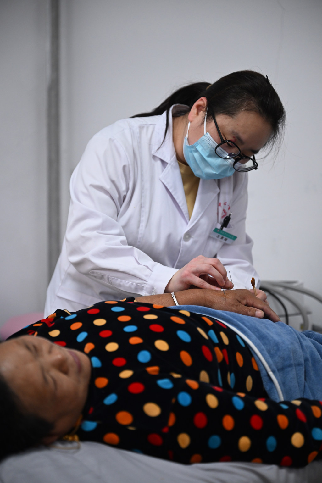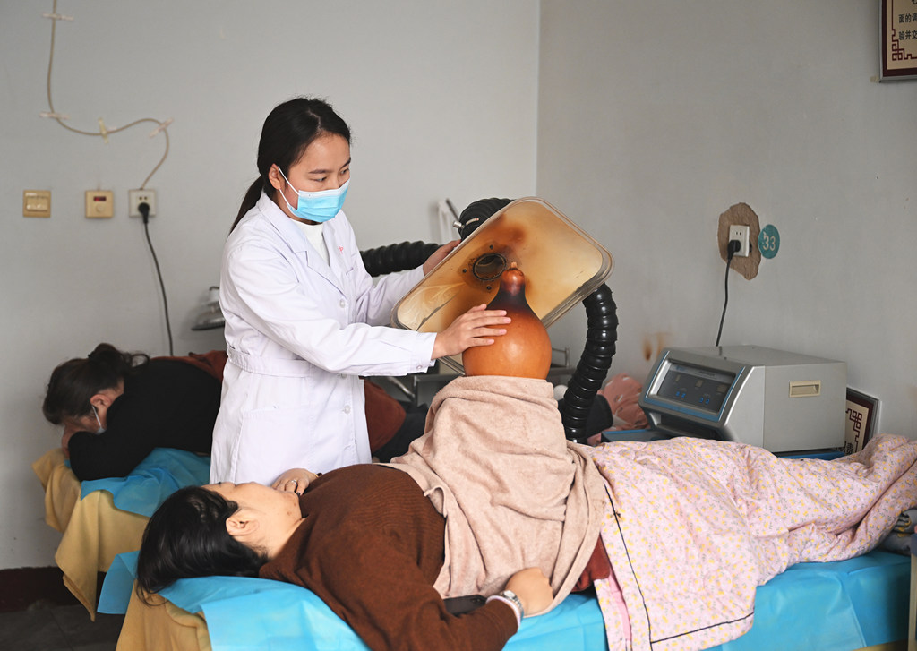 11月5日,内丘县内丘镇卫生院执业中医师谢巧利在为患者做艾灸治疗。