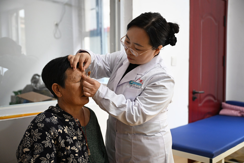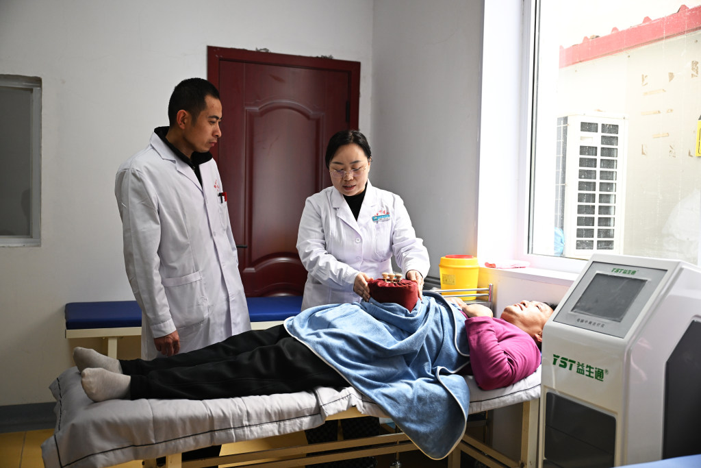 11月5日,内丘县柳林中心卫生院副主任医师左素梅为患者进行针灸治疗。