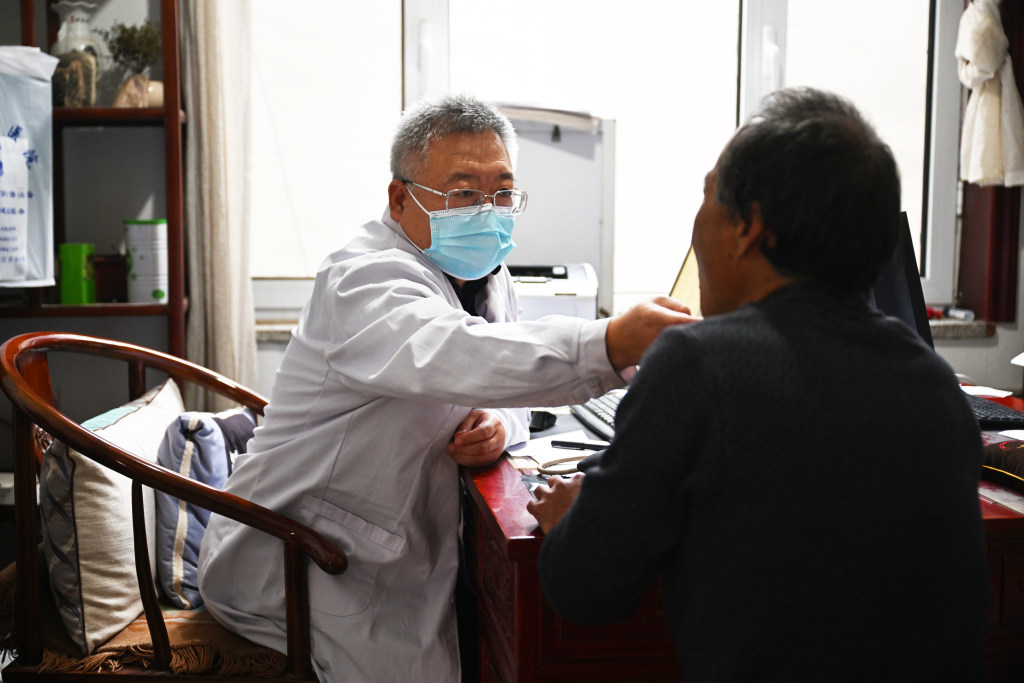 11月5日,内丘县内丘镇卫生院中医师李海坤在为患者诊病。