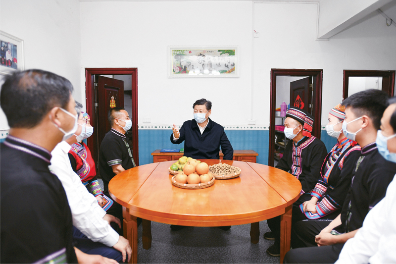 2020年9月16日至18日,中共中央总书记、国家主席、中央军委主席习近平在湖南考察。这是16日下午,在郴州市汝城县文明瑶族乡沙洲瑶族村,习近平同村民朱小红一家拉家常。新华社记者 谢环驰/摄