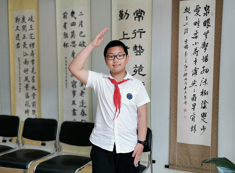 大陈岛老垦荒队员后代、浙江省台州市椒江区实验二小学生李杭骏行队礼(2019年5月27日摄)。新华社发(王卫君 摄)