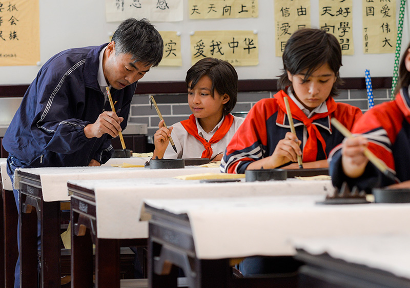 在新疆疏附县托克扎克镇中心小学书法教室内,王庄铁老师在教学生写毛笔字(2017年9月26日摄)。新华社记者 赵戈 摄