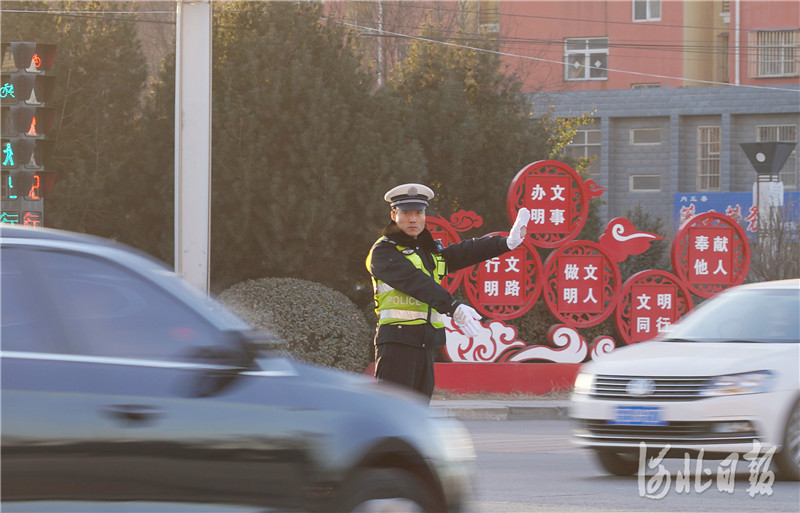 2021年1月1日,河北省邢台市内丘县公安交通警察大队民警在路口道指挥交通。当日是元旦小长假第一天,河北省邢台市内丘县交警、医护等人员坚守岗位,在忙碌中度过假期。河北日报记者史晟全摄2021...