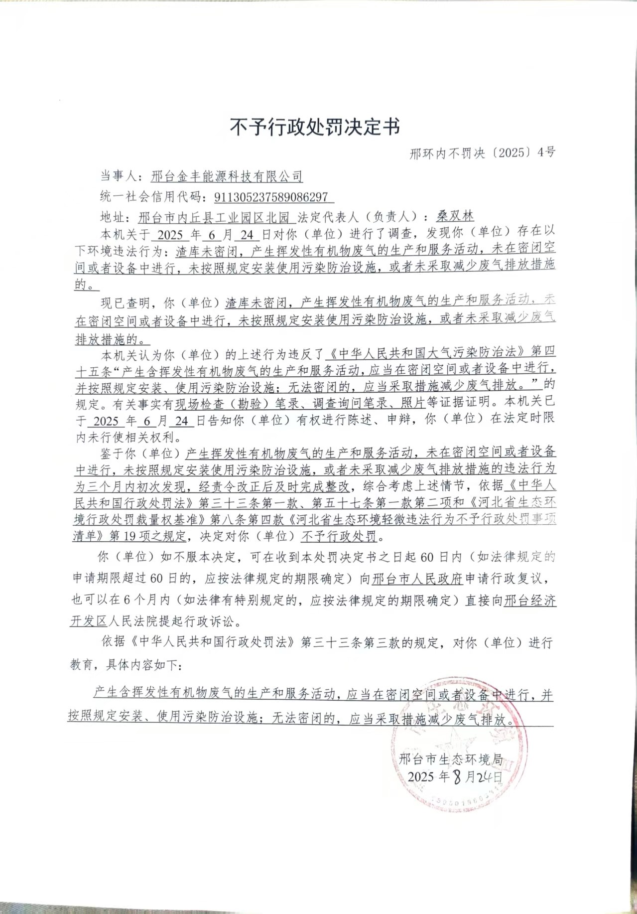 邢台金丰能源科技有限公司不予行政处罚决定书