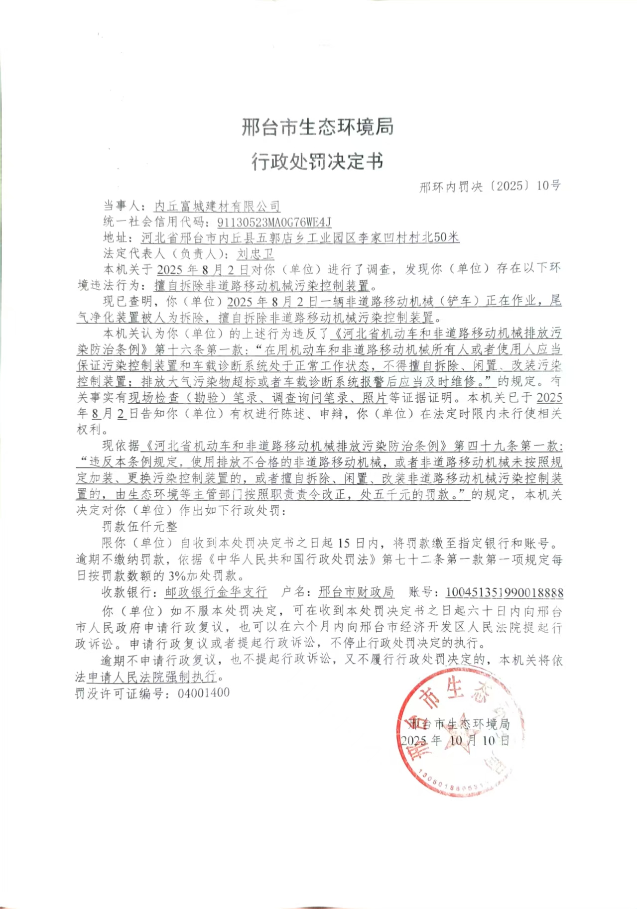 内丘县固特新型建材厂行政处罚决定书